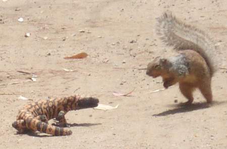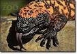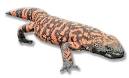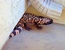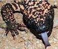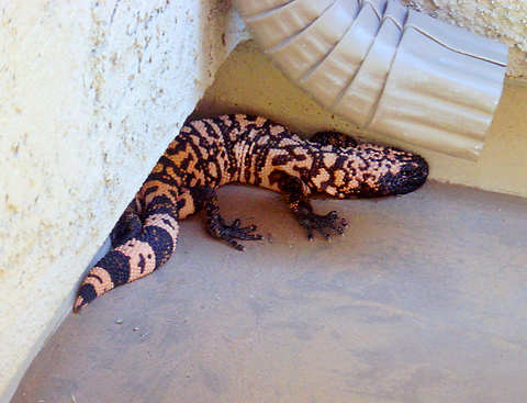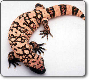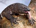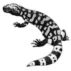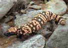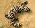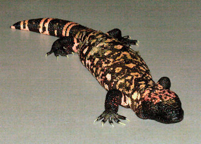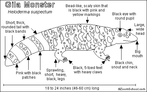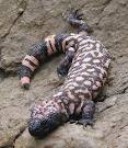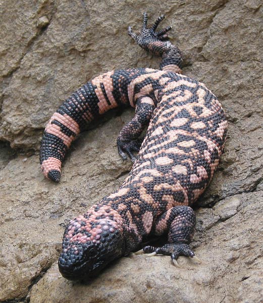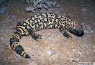 The Gila Monster is one of only two species of venomous lizards; both are of the family Helodermatidae and both are similar in appearance and habits. Its venomous cousin, the Mexican Beaded Lizard (Heloderma horridum), is slightly larger and darker. Most of the Gila Monster's teeth have two grooves that conduct the venom, a nerve toxin, from glands in the lower jaw. The toxin is not injected like that of the snake, but flows into the wound as the lizard chews on its victim. While the bite can overpower predators and prey, it is rarely fatal to humans.