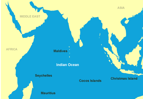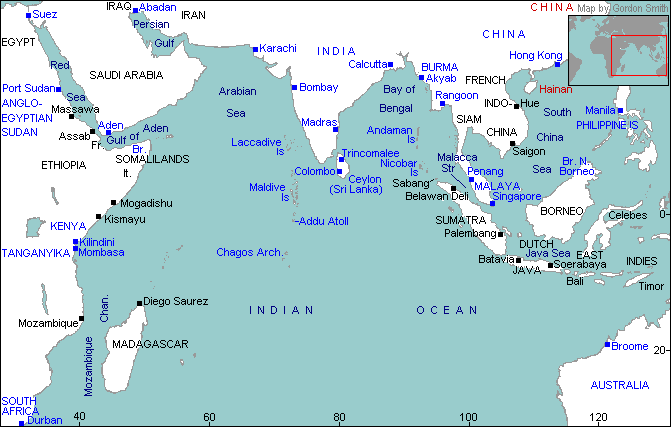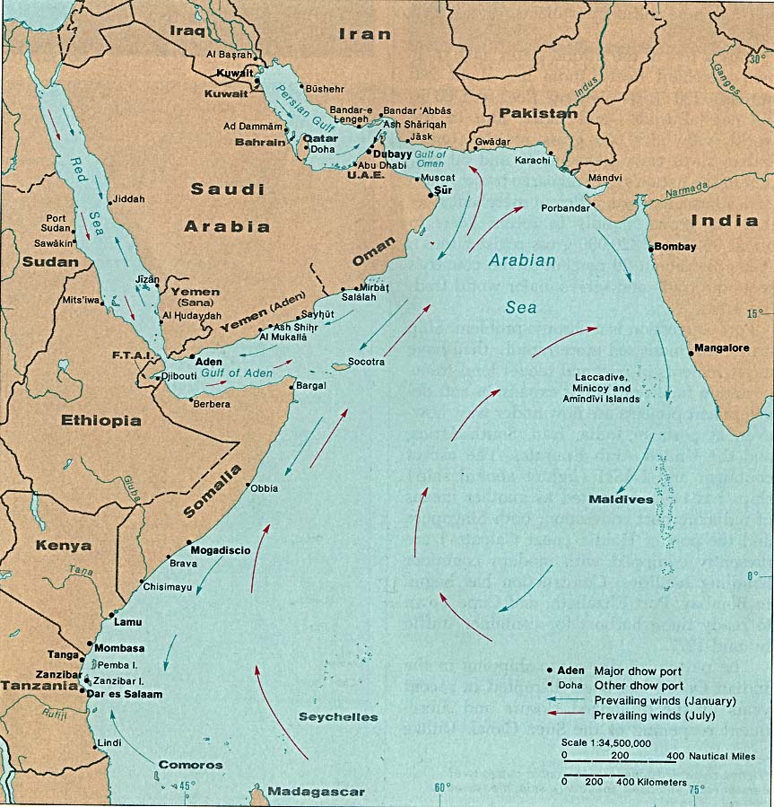 The surface dominated by counterclockwise gyre (broad, circular system of currents) in the southern Indian Ocean; unique reversal of surface currents in the northern Indian Ocean; low atmospheric pressure over southwest Asia from hot, rising, summer air results in the southwest monsoon and southwest-to-northeast winds and currents, while high pressure over northern Asia from cold, falling, winter air results in the northeast monsoon and northeast-to-southwest winds and currents; ocean floor is dominated by the Mid-Indian Ocean Ridge and subdivided by the Southeast Indian Ocean Ridge, Southwest Indian Ocean Ridge, and Ninetyeast Ridge.