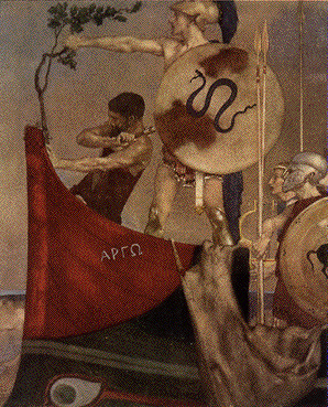 According to Apollonius of Rhodes, 55 men accompanied Jason; Apollodorus lists 43 men and one woman, and various numbers can be derived from other sources. The lists do not correspond very well, but the following are some of the more famous names mentioned: Orpheus (the greatest musician of the ancient world); Heracles (the son of Zeus, famous for his Twelve Labors); Hylas (Heracles' companion); Telamon (the father of Ajax); Peleus (the father of Achilles and the brother of Telamon); Argos (the builder of the Argo); Polydeuces and Castor (or Pollux and Castor -- known as the Dioscuri, they were the sons of Leda and Zeus, and the brothers of Helen of Troy); Meleager (who killed the Calydonian boar); Zetes and Calais (the Boreads); Theseus (who killed the Minotaur and the hero of a number of other legends); Laertes (father of Odysseus); Autolycus (son of Hermes and a master thief); Atalanta (a great huntress who was the first to wound the Calydonian boar and was beloved by Meleager).
