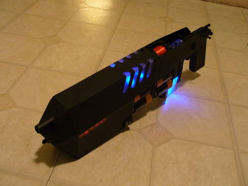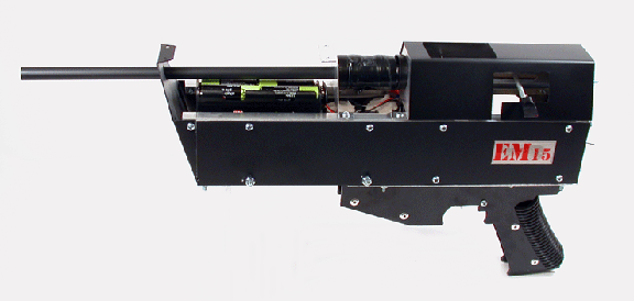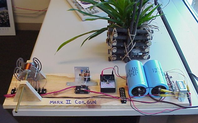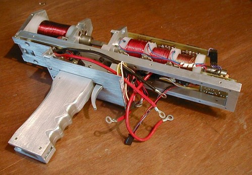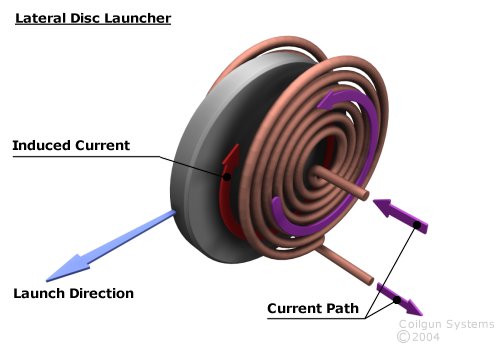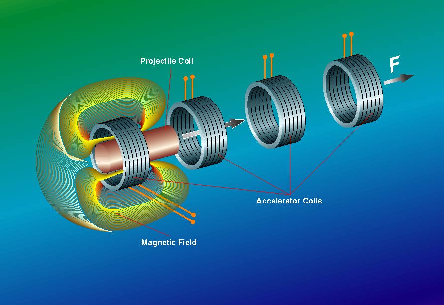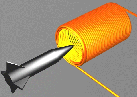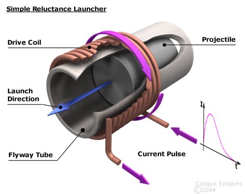 Coilguns(Pulse Accelerators), like railguns(Linear Accelerators), use intense electromagnetic fields to propel objects at incredible velocities unreachable with modern gas driven weaponry (given enough stored energy of course). A coil gun is known as a reluctance coil gun. The coil uses its electromagnetic field to pull a ferromagnetic(magnetically affected) projectile, in this case a shaped steel round, toward its center. Ideally the current supporting the electromagnetic field will turn off when the projectile is in the center allowing the projectile to continue traveling down the barrel, out the gun, and to the target. Use a coil and a few batteries to understand the properties of this system better. Many coilguns incorporate multiple stages at lower energy levels as efficiency tends to die off as more Stored Energy is used for a single coil design.